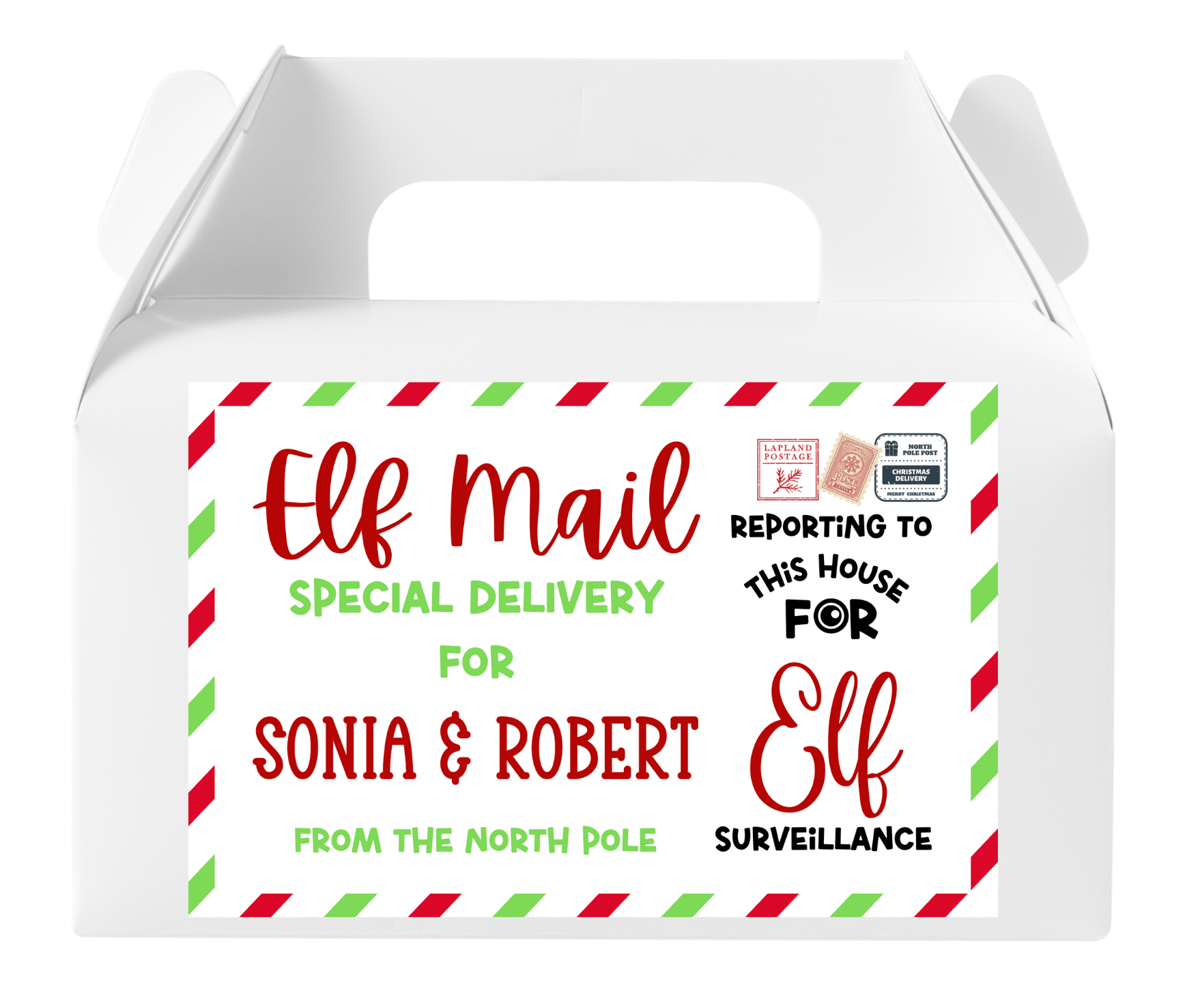 White gable box with Elf Mail Special Delivery label